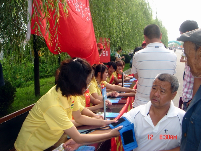 同学们在刘浩、孙铭两位老师的带领下,早早地来到凉泉镇的集市上,为老乡们测血压、量脉搏、发放卫生用品等,深受欢迎。