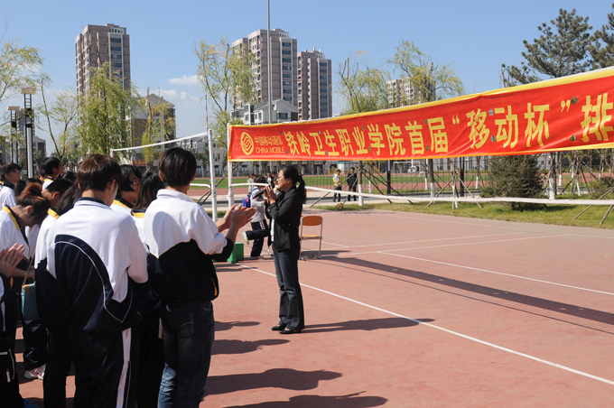 9月20日中午,由我院高职六系一部主办,铁岭县移动公司协办的“铁岭卫生职业学院首届‘移动杯’高职排球比赛”在我院排球场地拉开了序幕,院党委副书记杨丽清亲临现场并在开幕式上讲话。杨书记说,本次比赛意在丰富同学们的课余文化生活,增强同学们的团队精神和集体荣誉感,加强同学们户外锻炼意识,增进各系、部之间的交流,比赛要本着友谊第一、比赛第二的原则,赛出风格、赛出水平、充分展现我院高职学生的精神风貌。据悉本次比赛共有8个代表队参加,将进行28场比赛。