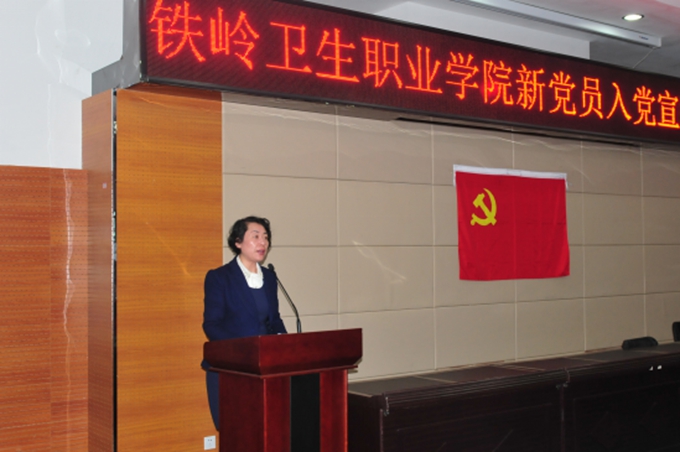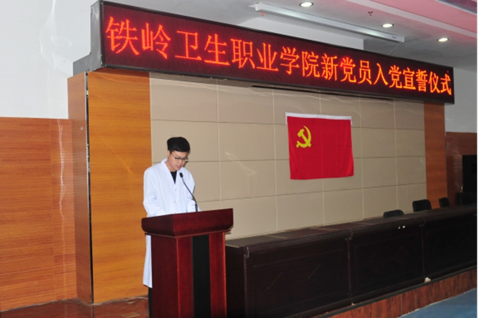 宣誓仪式在庄严的《国际歌》声中拉开了序幕,党委工作部宣传科科长马腾�宣读了新发展的党员名单,随后,康复治疗技术系党支部书孟繁明带领新党员宣誓,14涉外护理一班魏建宇同学和第九党支部书记袁畅代表新、老党员相继发言。最后,院党委书记左力做了重要讲话,她代表院党委向全体新党员表示热烈祝贺并提出了明确的要求,希望全体党员不辜负院党委的期望,发扬我党的优良传统,牢记全心全意为人民服务的宗旨,在各自的学习和工作岗位上充分发挥党员的先锋模范作用,为党旗增辉。