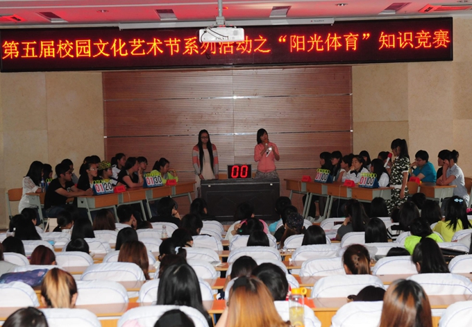 5月22日下午,我院团委在图书馆报告厅举行了第五届校园文化艺术节系列活动之“阳光体育”知识竞赛。本次活动经过笔试的选拔,八个系(部)中分数最高的三名选手组成该系(部)代表队,比赛中各系部竞争激烈、你追我赶,最终护理系、营养系技高一筹,赢得了本次比赛的一等奖。
