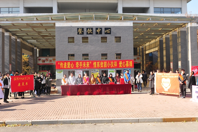 2016年10月17日为我国的第三个扶贫日,也是第24个国际消除贫困日,为了更好的实施精准扶贫精准脱贫基本方略携手消除贫困,促进共同发展。2016年11月2日中午11:30在我院餐饮中心门前,我院康复系志愿者服务队组织举办了“传递爱心,牵手未来”情系贫困小伙伴爱心募捐活动。