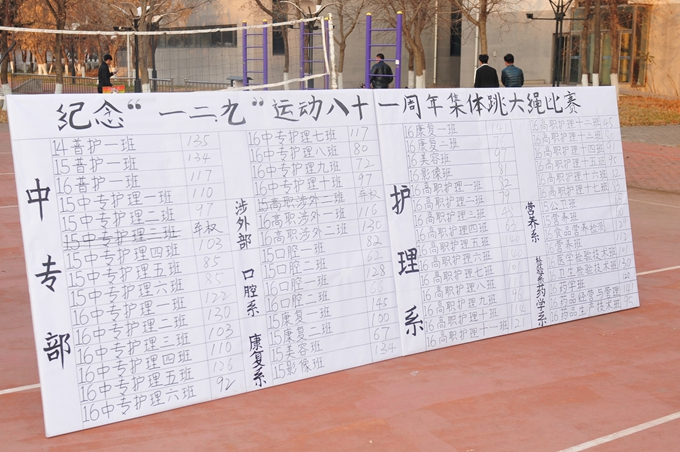 11月16日下午两点,纪念“一二.九”运动集体跳绳比赛在篮球场举行。此次比赛得到了各系(部)同学的广泛参与,共有六十个班级组队报名参赛。经过激烈的角逐,最终15级康复治疗技术1班等两个班级荣获一等奖,16级高职护理五班等三个班级荣获二等奖,14级普专护理班等五个班级获得三等奖,16级食品营养班等八个班级获得优秀组织奖。