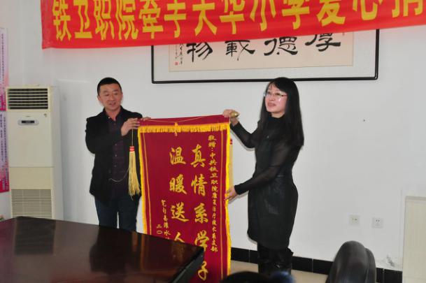 11月24日上午,在我院行政楼三楼会议室举行了一场充满爱心与温情的爱心捐赠仪式,来自丹东市灌水县天华村天华小学纪桂林等四名老师手捧一面锦旗表达了对我院全体师生的感激之情。