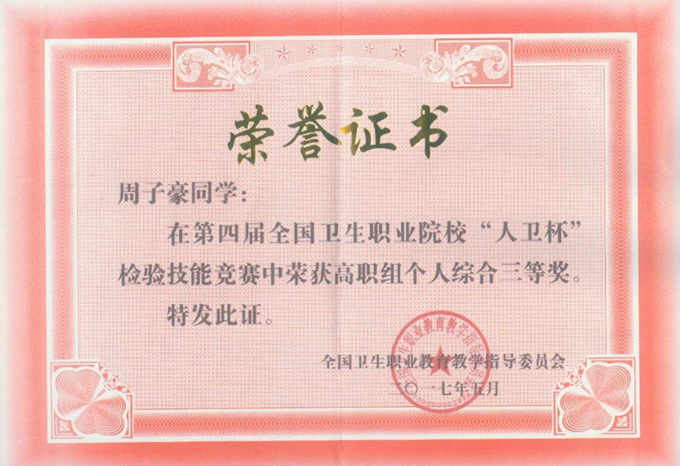 2017年5月26日至28日,在全国卫生职业教育教学指导委员会主办的第四届全国卫生职业院校“人卫杯”检验技能竞赛(高职组)中,我院医学检验系周子豪、李春勃两名同学获个人综合三等奖,王佳美获个人综合优秀奖。