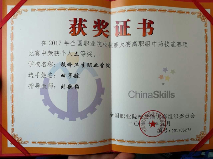 2017年6月3日-4日,全国职业院校技能大赛高职组中药技能赛项在江苏省连云港中医药高等职业技术学校隆重举行,我院药学系田宇航同学代表辽宁省参加比赛并荣获三等奖。