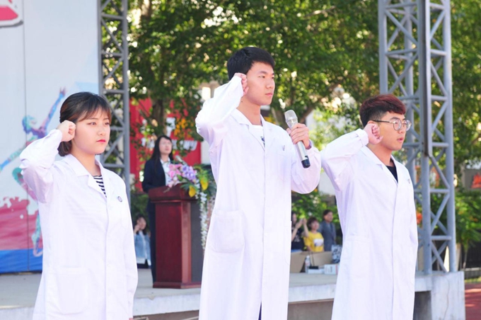 开学典礼由副院长宋煜主持,来自药学系的石珊珊同学代表2017级新生进行了发言,表达了新生踏实学习、磨砺自己的坚定决心;已在202医院实习的我院优秀实习生代表王辰元同学代表老生发言,向学弟学妹们送去了真诚的祝福并介绍了学习经验;沈阳金赛义齿制作中心培训部主管赵雨代表毕业生讲话,鼓舞新生们向着梦想前进,药学系主任赵立彦作为教师代表进行了发言,她代表全体教师对新生提出了学习要求并道出了对学生的殷切嘱托;药学系刘思彤、护理系史海瑞、口腔医学技术系顾鸿丞带领全院师生领誓《医学生誓言》,声音瞬间传变了整个会场,将气氛推向了高潮。