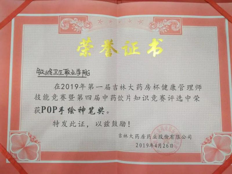 2019年4月23-26日,我院校企合作单位吉林大药房举办“东北三省合作院校‘吉林大药房杯’健康管理师技能竞赛”,包括我院在内的14所院校参加了比赛,我院获得了团体三等奖,并在“POP海报设计”单项比赛中获得第一名的好成绩。