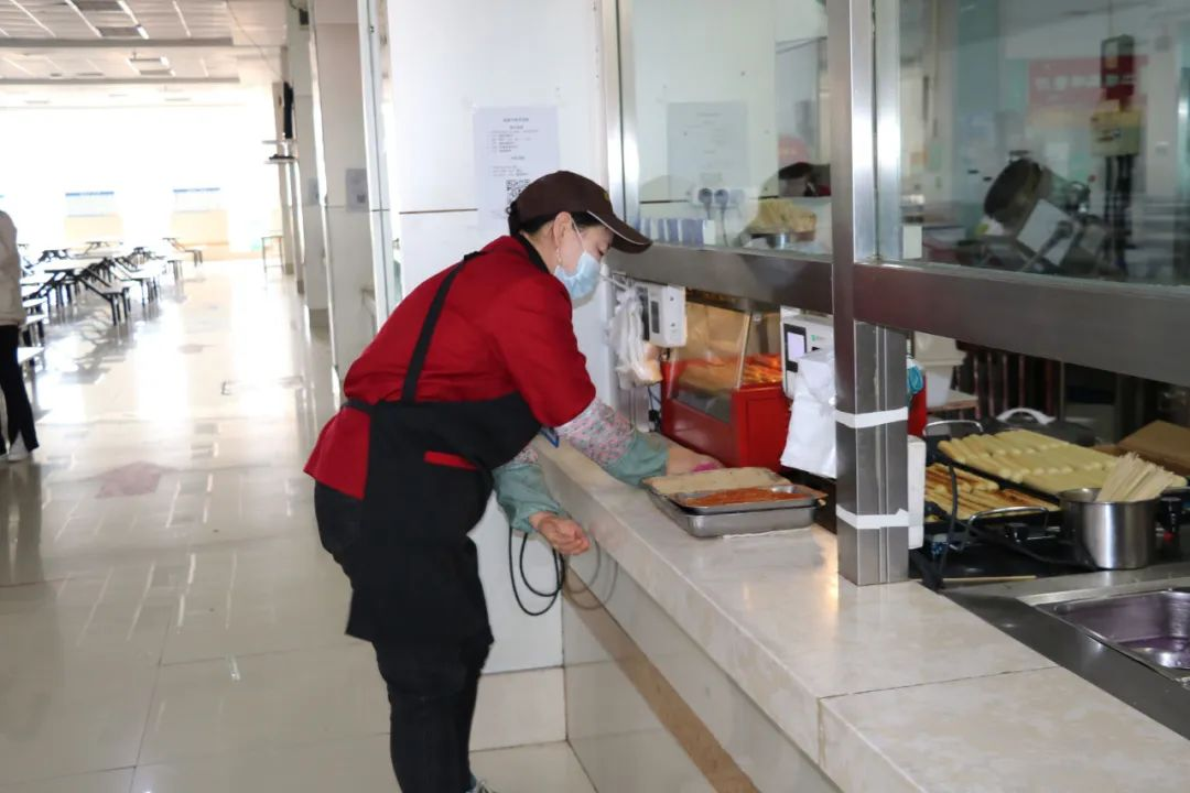 晨检后的食堂后厨灯火通明,后勤保障组的工作人员检查食品的新鲜度,餐饮中心职工开始动手准备食材,以满足全校师生的用餐需求。对于学生们来说,早起吃到热腾腾的三餐是一件幸福的事,但在这份幸福的背后,是后勤保障组和食堂工作人员日复一日的早起和坚守。